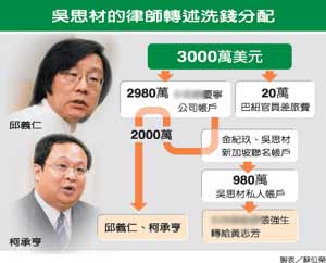 據(jù)臺灣《聯(lián)合報》報道,徐景星說,根據(jù)吳思材留下的洗錢分配流程數(shù)據(jù)及吳思材先前告訴他,臺涉外部門透過辦理“機(jī)密外交”常使用的一家人頭公司(慶寧公司)賬戶,先將兩千九百八十萬美元匯到金紀(jì)玖和吳思材在新加坡銀行開立的聯(lián)名賬戶內(nèi);其中九百八十萬美元,金紀(jì)玖對吳思材說:“老板(邱義仁)指示要把九百八十萬匯到你個人賬戶內(nèi)!庇谑菂呛徒鸺o(jì)玖辦理轉(zhuǎn)匯,當(dāng)時張瓊森也在場。