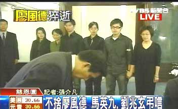 據(jù)臺灣TVBS報道,廖風(fēng)德因病猝逝可謂“驟失英才”,讓人措手不及,他的家人在慈恩園為他布置靈堂,在今天上午10點開始讓親友吊唁,面色凝重的馬英九、準(zhǔn)“行政院長”劉兆玄、“立委”蔣孝嚴(yán)也來到靈堂送他最后一程。