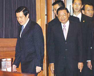 馬英九10晚在5.20后首次出席;鶗_商端節(jié)聯(lián)誼活動晚宴,與今天赴大陸展開兩會復談的;鶗麻L江丙坤一同進入會場。 聯(lián)合報圖