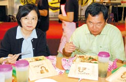 民進黨主席蔡英文(左)吃著印有自己肖像的便當時,忍不住欣喜滿足,一旁的嘉義縣長陳明文也津津有味地品嘗。