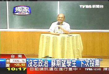 鼓勵(lì)學(xué)生,也像在鼓勵(lì)自己,蘇貞昌提到:“有時(shí)候選舉,也是這次沒(méi)有支持你,你跟他,喔…不共戴天,非報(bào)這個(gè)仇不可,這樣選舉沒(méi)3次,你就都沒(méi)朋友了,所以各位同學(xué),如果上次沒(méi)有投票的,(記得)下一次。”
