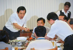 報(bào)道說(shuō),馬英九一坐下來(lái),就拿起筷子準(zhǔn)備開(kāi)動(dòng)。馬英九替每位“閣員”夾菜,把白斬雞夾到“閣員”的盤(pán)子上時(shí),還不忘沾下醬油,相當(dāng)細(xì)心。