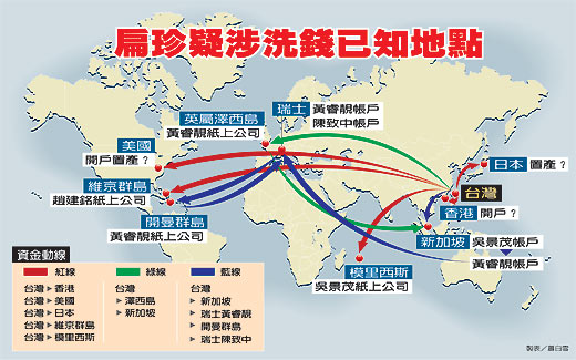 特偵組追查扁家海外賬戶,發(fā)現(xiàn)除了新加坡匯到瑞士的兩千一百萬美元、澤西島匯到新加坡的一千五百多萬美元,扁家在日本、美國(guó)、甚至香港等地也可能有密帳,甚至置產(chǎn)等,未曝光金額可能更驚人。