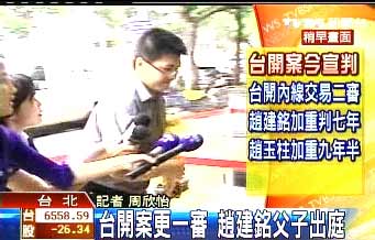 發(fā)表評論  中新網9月4日電 臺開內線交易案今天在臺灣“高院”再度開庭,陳水扁女婿趙建銘與其父親趙玉柱出庭。上午趙建銘來到“高院”,對于陳幸妤說自己身體也不好,趙建銘微笑沒有回應。