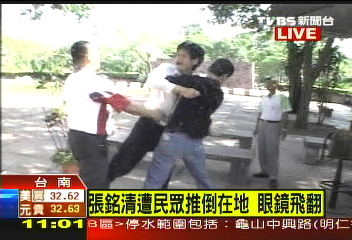 環(huán)球時(shí)報(bào)駐臺(tái)北特約撰稿人周先報(bào)道:據(jù)臺(tái)灣中天電視臺(tái)21日報(bào)道,抵臺(tái)進(jìn)行學(xué)術(shù)交流的大陸海協(xié)會(huì)副會(huì)長張銘清21日上午在臺(tái)南市安平古堡參觀時(shí),被綠營支持者推倒在地,當(dāng)張銘清準(zhǔn)備乘車離開時(shí),有“臺(tái)獨(dú)”分子甚至跳上張的座車車頂狂踩,試圖阻止張銘清離開。另據(jù)臺(tái)灣TVBS電視臺(tái)消息,張銘清后腦勺被打,連眼鏡都被推飛了出去。