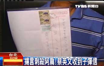 據(jù)稱,這封掛號(hào)恐嚇信內(nèi)容寫著,“聽說阿扁要參加25日大游行,上次我沒射準(zhǔn),這次我會(huì)瞄準(zhǔn),要阿扁小心一點(diǎn)”。