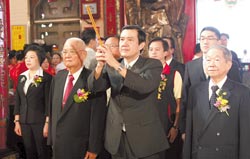 臺灣基隆市天顯宮主祀的伍顯大帝26日圣誕,馬英九參拜時,呼吁臺民眾相信“政府”,攜手度過金融風暴。(圖:臺灣《中國時報》)