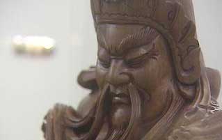 在8月初記者會曝光的關公神像,一走入陳水扁卸任后的辦公室,柜臺顯得空蕩蕩,沒有什么擺設,往內(nèi)一走在廊道的正中間,馬上映入眼簾的就是長長的三個擺飾柜,一共有六樣紀念品,但最受矚目的是一尊木雕的關公像,長長的胡子略帶笑容,一派自在的關公悠閑的坐在椅子上,既沒有拿刀也沒有看書,反倒像是笑看世間事,左下側也有一尊玉雕的關公頭像,也就是半身關公。