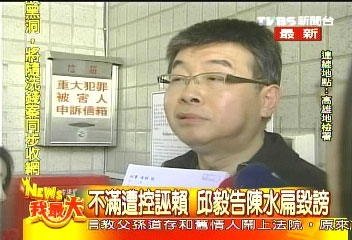 邱毅日前指陳水扁利用專機(jī),把巨額款項(xiàng)運(yùn)送到帕勞分行,陳水扁辦公室反駁是胡亂指控,邱毅4日南下高雄地檢署,控告陳水扁。圖片來源:臺(tái)灣TVBS