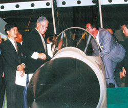 李登輝全程參與幻影購(gòu)機(jī)案。圖為1993年臺(tái)北國(guó)際航天展,李登輝參觀達(dá)梭集團(tuán)展出的幻影2000型戰(zhàn)機(jī)。