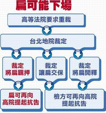 陳水扁去年底被起訴、無保釋放后,立即提起抗告,臺灣高等法院于十二月十七日認為,扁可能在審判中影響證人造成案件審理困難,駁回抗告;十二月二十八日,法院認定扁的犯罪嫌疑重大,且扁家在海外有十幾億元資產(chǎn),隨扈又無法確實監(jiān)管其行蹤,有逃亡、勾串、滅證等羈押理由;今年一月七日時,仍認同檢方意見,同意押扁。