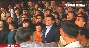 馬英九于前晚夜宿嘉義市中信飯店,1日一早在飯店前,巧遇100多名大陸旅客,都擠著要和他合影,馬英九索性主動(dòng)走入大陸游客群中來(lái)個(gè)大合照。