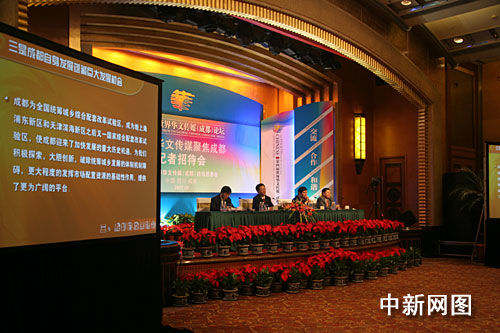 [中共成都市委常委、宣傳部長(zhǎng)郝康理]: 各位新聞界的朋友們,女士們,先生們,大家下午好。時(shí)值金秋九月,美麗的蓉城榮幸地迎來(lái)了第四屆世界華文傳媒論壇的舉行。為了讓廣大海外媒體更好地了解成都,今天我們專門在此舉行“世界華文傳媒聚焦成都”專題記者招待會(huì),由成都市領(lǐng)導(dǎo)向各位記者介紹成都市的基本情況,以及成都市舉辦本屆世界華文傳媒論壇的相關(guān)情況。出席今天記者招待會(huì)的領(lǐng)導(dǎo)有:中共成都市委副書記、成都市市長(zhǎng)葛紅林先生;成都市委常委孫平先生,成都市副市長(zhǎng)何華章先生,以及成都市發(fā)展改革委員會(huì)、投資促進(jìn)委員會(huì)、商務(wù)局等部門的負(fù)責(zé)人。除了參加本屆論壇的海外記者出席記者招待會(huì)外,還有國(guó)內(nèi)外眾多的媒體記者參加招待會(huì),在這里向大家表示熱烈的歡迎。為了讓第一次光臨成都的媒體朋友充分了解成都,首先請(qǐng)大家看張藝謀導(dǎo)演拍攝的宣傳片,《成都—一座來(lái)了就不想離開的城市》。 |