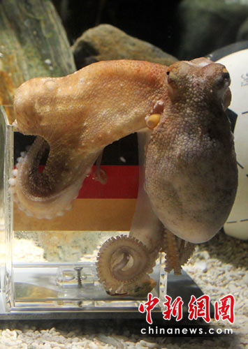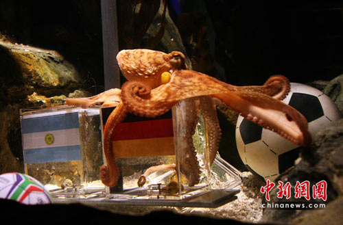 據(jù)悉,海洋館員把分別印有德、阿旗幟的貝殼放入玻璃缸,與對(duì)英格蘭隊(duì)比賽前脆快取出德國(guó)那枚貝殼不同,章魚“保羅”對(duì)德國(guó)和阿根廷的對(duì)決有些“猶豫不決”,“考慮了長(zhǎng)達(dá)一小時(shí)”但是最終還是取出了印有德國(guó)旗幟玻璃缸里的貝殼。