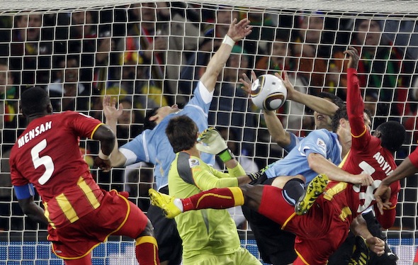 在比賽進(jìn)行到第121分鐘,加納隊(duì)在烏拉圭隊(duì)門前連續(xù)形成機(jī)會(huì),第一次射門被蘇亞雷斯在門前用身體擋出,不過(guò)當(dāng)加納隊(duì)的小將阿迪亞補(bǔ)射空門時(shí),在球門線上的蘇亞雷斯將球用手擋出。裁判向他出示了紅牌,將其罰下,并判給加納隊(duì)一個(gè)點(diǎn)球。