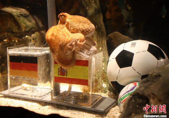在當(dāng)?shù)貢r(shí)間6日,德國(guó)奧博豪森一家海洋館的章魚保羅再次出陣,預(yù)測(cè)西班牙與德國(guó)的這場(chǎng)世界杯半決賽的勝負(fù)。此前,因?yàn)樗呀?jīng)成功預(yù)測(cè)德國(guó)隊(duì)世界杯前5場(chǎng)的比賽,而讓眾多德國(guó)人乃至世界范圍的球迷成為其信徒,認(rèn)為它才是這個(gè)星球上的“真相帝”。