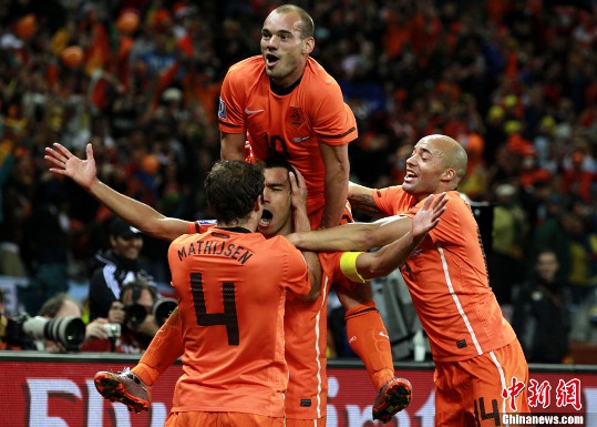 下半場,荷蘭隊對烏拉圭大門形成圍攻之勢,第70分鐘斯內(nèi)德橫向帶球后射門,皮球打在后衛(wèi)腿上折射,穆斯萊拉鞭長莫及。雖然范佩西處在越位位置,但主裁判依舊認定進球有效,正是憑借這個進球荷蘭隊2比1再度領(lǐng)先。