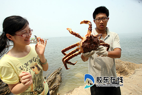 遠(yuǎn)渡重洋來(lái)到煙臺(tái)的這幾只大螃蟹,不但體格超大,而且還有一些特異功能呢。其中有只螃蟹6斤重,展開(kāi)之后一米長(zhǎng),售價(jià)接近2000元。矯先生所開(kāi)的大排檔員工小魏特地讓這只螃蟹給記者演示了一下“霸王”的預(yù)測(cè)本領(lǐng)。