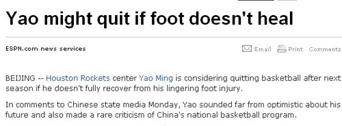 中新網(wǎng)7月28日電 據(jù)EPSN報(bào)道,姚明近日在北京參加慈善晚宴時(shí),在接受網(wǎng)友提問中親口證實(shí)將在今年季前賽復(fù)出,但他同時(shí)講出驚人之語:一旦出現(xiàn)腳傷反復(fù)的最壞情況,不排除下個(gè)賽季就退役。