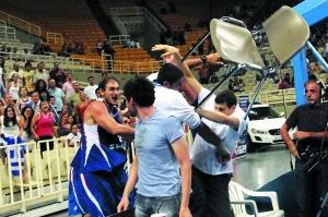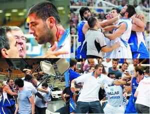 昨天的比賽臨近結(jié)束時,希臘隊當(dāng)時以74比73領(lǐng)先塞爾維亞,隨后雙方兩名無球隊員產(chǎn)生口角,并發(fā)展成肢體沖突。而后發(fā)生了最殘酷的一幕,塞爾維亞隊隊長、效力于NBA雷霆隊的科斯蒂奇卷入沖突,他抓起一把椅子丟向比賽中與其對位的希臘隊中鋒肖特薩尼蒂斯,不料椅子卻擊中因傷坐在希臘隊替補(bǔ)席上的布魯西斯,后者頭部頓時鮮血直流。此后有多名球員卷入此次群毆事件,現(xiàn)場亂作一團(tuán)。據(jù)美聯(lián)社報道,雙方后在球員通道內(nèi)再次發(fā)生斗毆。而就在這起惡性打架事件發(fā)生前6分鐘左右,塞爾維亞隊主帥伊夫科維奇因與主裁判發(fā)生沖突而被吹了兩次技術(shù)犯規(guī),最終被逐出場。