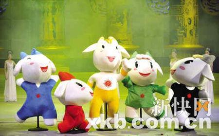 “五羊”是廣州市最為知名的一個標志,以五只羊作為吉祥物,充分體現(xiàn)了東道國、主辦城市的歷史底蘊、精神風貌和文化魅力。這五只羊有著與北京奧運會吉祥物“北京歡迎你”類似的名字,“阿祥”、“阿和”、“阿如”、“阿意”、“樂羊羊”組成“祥和如意樂洋洋”。