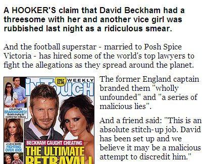 北京時(shí)間9月23日,據(jù)英國(guó)小報(bào)《太陽(yáng)報(bào)》報(bào)道,26歲的妓女艾瑪-尼西近日對(duì)媒體宣稱,2007年8月,在紐約的Le Parker Meridien酒店,貝克漢姆支付了3200英鎊和她上床,尼西還稱,另一名女孩后來也加入了,小貝另支付了1500英鎊,先是觀看兩名女孩的親熱表演,然后自己加入了3P游戲。