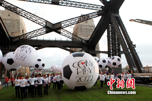 為表達(dá)悉尼對澳大利亞申辦2022年FIFA世界杯的支持,一個(gè)印著“Come Play”字樣,高達(dá)四米的巨型足球沿著澳洲標(biāo)志悉尼大橋的中心滾動(dòng),帶動(dòng)起“來踢球”的熱忱與激情。