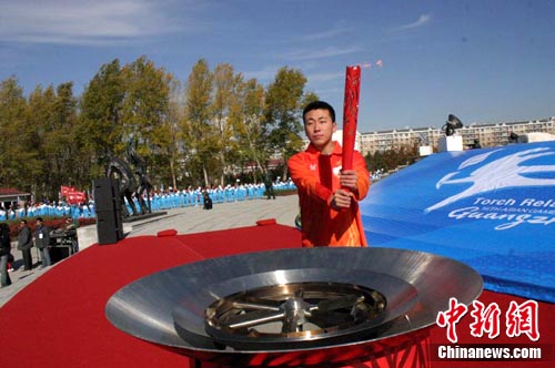 中新社長(zhǎng)春10月15日電 (李彥國(guó) 田偉)第16屆廣州亞運(yùn)會(huì)火炬15日在吉林省長(zhǎng)春市進(jìn)行展示性傳遞,這是本屆亞運(yùn)會(huì)火炬?zhèn)鬟f在廣東省外的第二站。16名火炬手在長(zhǎng)春世界雕塑公園完成16棒傳遞,5000余名長(zhǎng)春市民現(xiàn)場(chǎng)見證這一時(shí)刻。