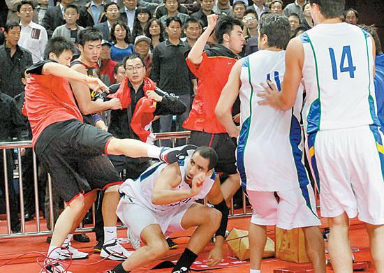 10月12日,中國球員(紅衣)與巴西球員大打出手。新華社記者 王頌攝