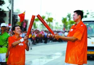 男籃老隊長王治郅(右)在交接火炬。昨日,廣州亞運會火炬?zhèn)鬟f活動在惠州舉行。 新華社記者 劉大偉 攝