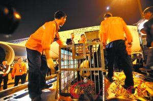 廣州日報(bào)10月28日報(bào)道 23時(shí)58分,第一批兩只熊貓寶寶津柯和博斯同時(shí)被運(yùn)下飛機(jī),2分鐘后就被裝上了前來迎接它們的車輛。其余4只熊貓?jiān)诘诙黄鹣铝孙w機(jī),所有熊貓寶寶在今日凌晨0時(shí)10分裝車完成,被送往香江野生動物園。
