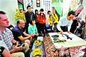 下午2時整,羅澤權(quán)下樓迎接德國游客。一名德國游客連連稱贊說,“能夠把古建筑保留下來,對于這個地區(qū)非常有意義,都府社區(qū)古色古香,反映了廣州的歷史文化,非常棒!”過了一會兒,羅澤權(quán)老人拿出筆墨紙硯,揮毫寫下了一個大大的“!弊,并將這幅書法送給了其中一名德國游客。臨別時,23名德國游客依依不舍地與羅澤權(quán)老人一一握手道別,并祝他老人家“健康長壽,越活越年輕”!