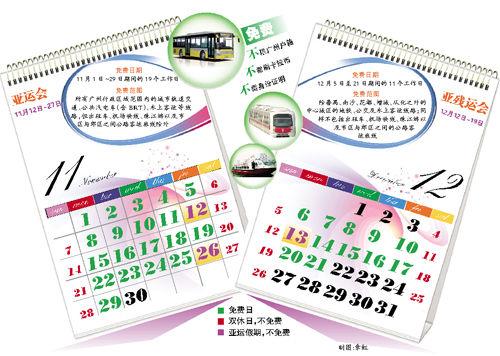 根據(jù)相關(guān)規(guī)定,在亞運(yùn)會(huì)及亞殘運(yùn)會(huì)機(jī)動(dòng)車單雙號限行的46天里(11月1日至29日、12月5日至21日),剔除13個(gè)雙休日和3天新增假期后的30個(gè)工作日里,市民都可免費(fèi)享受公共交通服務(wù)。有關(guān)部門預(yù)計(jì),免費(fèi)期間廣州每天將新增300萬人次的客流,高峰期可能出現(xiàn)“井噴”,請沒有剛性出行需求的市民注意錯(cuò)峰出行。