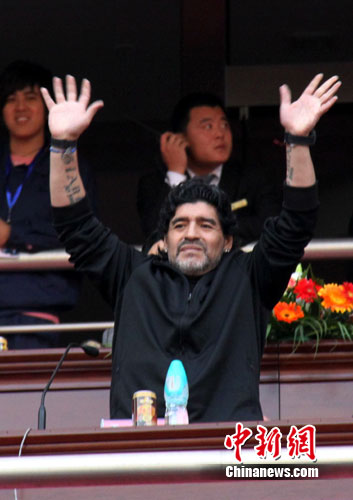 中新社濟(jì)南11月5日電(牛杰峰)5日下午16時(shí)左右,世界球王馬拉多納來(lái)到山東濟(jì)南奧體中心參加山東聯(lián)隊(duì)與阿根廷明星隊(duì)的慈善比賽。盡管姍姍來(lái)遲約一個(gè)小時(shí),但是鐵桿“粉絲”們的熱情仍然不減。