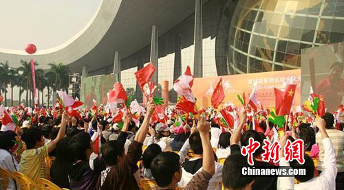 中新網(wǎng)廣州11月11日電(黃雪琴)11日上午9時30分,第16屆廣州亞運動會火炬?zhèn)鬟f(廣州站)最后一站傳遞活動在廣州大學(xué)城舉行。揚揚、朗朗、章子怡、鐘南山等130位名人齊上陣,亞運激情在廣州大學(xué)生中激蕩。