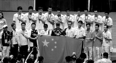 艱難戰(zhàn)勝韓國(guó)隊(duì),賽后李永波帶領(lǐng)男隊(duì)打出特有的慶祝手勢(shì)。周民 攝