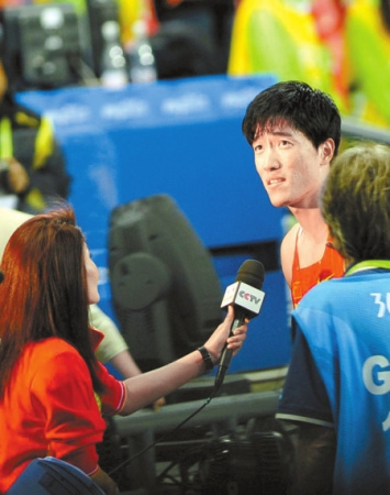 在賽道上僅僅逗留了13秒48,但在賽道一側(cè)的混合區(qū)里,近百名記者已經(jīng)等候了數(shù)十分鐘。終于,翹首企盼的飛人出現(xiàn)在通道的頂頭,狹窄的混合區(qū)里開始騷動(dòng),志愿者不得不手扶擋板,免于崩塌。