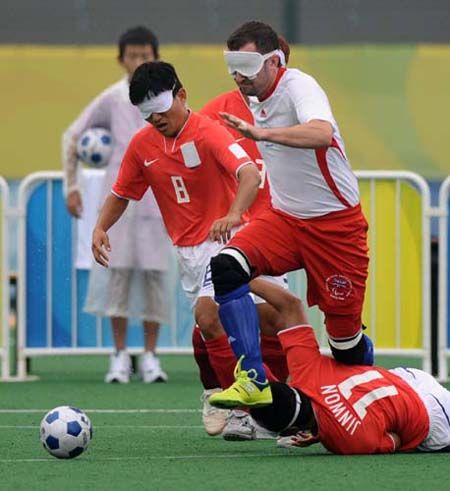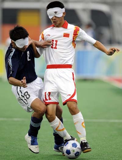 由于隊(duì)員視力問題,比賽中隊(duì)員只能依靠球發(fā)出的聲響來判斷球的位置,所以經(jīng)常會(huì)出現(xiàn)隊(duì)員找不到球的情況。在進(jìn)攻方向上還經(jīng)常要依靠引導(dǎo)員的幫助,隊(duì)員間的呼應(yīng)較多,所以攻防速度沒有普通的五人制足球快,傳接球次數(shù)相對(duì)也較少,烏龍球出現(xiàn)會(huì)多一些。 (來源: 亞殘運(yùn)會(huì)官方網(wǎng)站)