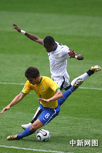 比賽開始后巴西隊(duì)并沒有急于大舉壓上進(jìn)攻,第14分鐘加納獲得任意球機(jī)會(huì),阿多的頭球被塞薩爾神勇?lián)涑,力保巴西城門不失。第16分鐘巴西獲得角球,卡卡前點(diǎn)擺渡,效力俄羅斯莫斯科中央陸軍的前鋒瓦格納墊射破門,幫助巴西1-0領(lǐng)先。隨后比賽雙方互有攻守,但都沒有進(jìn)球,上半場(chǎng)比賽結(jié)束,巴西1-0領(lǐng)先加納。
