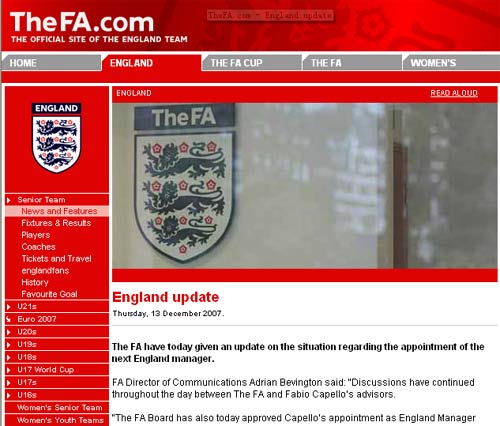 英格蘭足總新聞發(fā)言人貝溫頓表示,“英足總和卡佩羅的顧問已經(jīng)就執(zhí)教問題持續(xù)討論了一天。足總董事會今天已經(jīng)認(rèn)可了對于卡佩羅的任命。不過雙方還要繼續(xù)進(jìn)行合同方面的協(xié)商,這些工作將在明天繼續(xù)進(jìn)行!