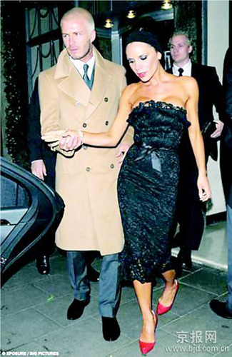 夫唱婦隨,維多利亞的穿著打扮也同樣的老氣橫生。當(dāng)晚維多利亞穿了一件鑲嵌蕾絲邊的連衣裙,腰間別了個(gè)蝴蝶結(jié),頭發(fā)盤(pán)起,頭上戴著黑色頭箍,臉上的妝依舊畫(huà)得很濃,還穿了雙紅色高跟鞋。不知道是擦得粉太重,還是新年活動(dòng)過(guò)于忙碌而體力透支,鎂光燈下的“辣妹”一臉慘白形像老態(tài)。英媒體諷刺這身打扮超出了她33歲的年齡,看起來(lái)簡(jiǎn)直可與丑劇大師馬塞歐比肩。(記者劉大偉)