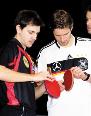 發(fā)表評論  波爾是德國乒乓球的標志性人物,而在德國最為普及的足球運動里,也有不少國腳喜歡打乒乓球。北京時間昨天凌晨,德國國家隊在柏林奧林匹克球場進行訓(xùn)練,在新聞發(fā)布會開始前,為廣大中國球迷熟悉的乒乓球選手波爾看望了國家隊的隊員,他同韋斯特曼和弗雷德里希切磋了乒乓球技,跟波多爾斯基等球員一起合影。另外,《越獄》德語版主題曲的演唱者、著名歌手阿德爾也來到國家隊,他和波爾一起同國腳們合影留念。