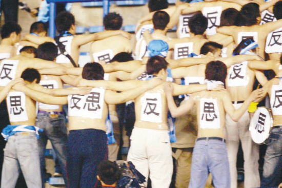 大連不愧為中國(guó)的足球城。2006年5月21日,一群大連球迷在看臺(tái)上光起膀子,背后貼滿了“反思”,這是中國(guó)球迷最真切的想法?上,中國(guó)足球沒(méi)有停止過(guò)反思,只是很少采取行動(dòng)。