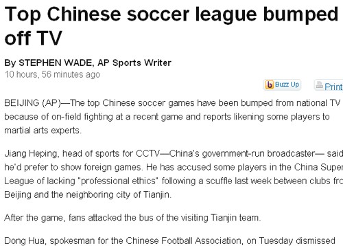 美聯(lián)社文章稱,中國足球的頂級聯(lián)賽已經(jīng)被“踢出”國家電視臺的節(jié)目單,因為最近接連不斷的球場暴力,在媒體報道中甚至被稱作“武術選手”。文章援引了央視體育頻道總監(jiān)江和平的說法稱,他更希望播出外國的體育節(jié)目!白罱谐(lián)賽非常混亂,有一些球員缺乏職業(yè)素質(zhì),”他指的是上周北京國安和天津泰達隊的比賽中,兩隊球員爆發(fā)了群毆事件,賽后一些球迷還襲擊了客場作戰(zhàn)的天津隊的大巴。
