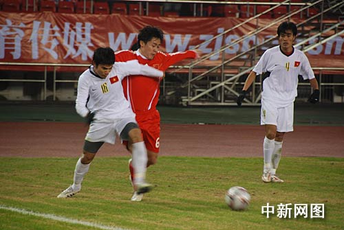 不過國足并沒有被突如其來的丟球打亂陣腳,第20分鐘憑借姜寧的妙傳造成郜林單刀,這次他把握住了機會低射命中,將比分改寫為2-1。7分鐘后,中國隊獲得角球機會,吳昊爭頂漏過皮球,杜威迎球怒射破門,將比分?jǐn)U大為3-1。第37分鐘,國足發(fā)動攻勢被越南隊后衛(wèi)破壞,姜寧在禁區(qū)前沿拿球后大力抽射,皮球洞穿了客隊大門。上半場比賽結(jié)束時,國足就以4-1大比分領(lǐng)先。