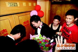 姚明、王治郅、易建聯(lián)、郭士強、阿的江、李楠等多位受邀的賓客因時間安排問題不能前來,但昨晚價位2888元/桌的喜筵在宏遠酒店國際宴會中心還是擺了62桌,超過600位賓客到場賀喜。剛剛帶中國U18國家男籃打完亞青賽的李春江及時從伊朗返回,杜鋒和劉曉宇、周鵬分別從烏魯木齊和拉斯維加斯訓練營趕回來,還有來自北京的胡加時、白喜林、匡魯彬等籃協(xié)領(lǐng)導,劉玉棟、呂嘵明等明星球員,再加上新娘子前藝術(shù)體操隊的一眾靚女隊友,整個婚禮仍不失為一場體育圈的明星派對。