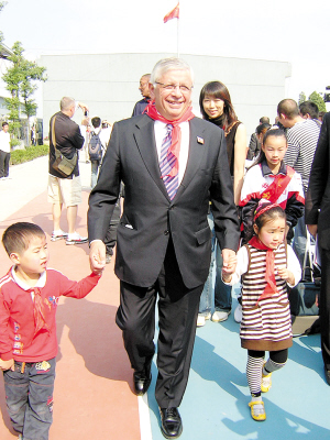 昨天下午,大衛(wèi)·斯特恩率領(lǐng)騎士眾星出現(xiàn)在上海閔行區(qū)的魯冰花農(nóng)民工小學(xué),NBA為這所學(xué)校捐建了一個(gè)籃球場(chǎng)、一個(gè)電腦室和一個(gè)圖書室,大衛(wèi)·斯特恩親自為這些康樂(lè)中心剪彩。在兩個(gè)小學(xué)生的牽引下,戴著紅領(lǐng)巾的大衛(wèi)·斯特恩滿面春風(fēng),看到孩子們?cè)缇妥诨@球場(chǎng)上等他到來(lái),斯特恩高興地向孩子們揮手致意。