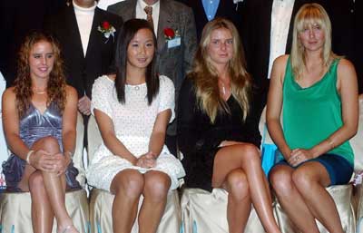 香港網(wǎng)球精英賽昨天在維多利亞公園中央場拉開戰(zhàn)幕。在前晚的賽前酒會(huì)上,彭帥和莎拉波娃等人坐到了一起,爭奇斗艷。(左起:彭帥、漢圖楚娃、莎娃)