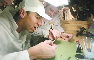 8月18日,菲爾普斯與世界最頂級(jí)的游泳運(yùn)動(dòng)員共同在朝陽公園的草地上吃午餐,陽光刺眼,他卻獨(dú)自躺在躺椅上享受日光浴。休息片刻,他站起身,漫不經(jīng)心地拿起一罐可樂,一仰脖喝了下去,隨后,大口吃著肉串,不時(shí)和旁邊的姑娘們說笑著,而近在咫尺就是黑壓壓的一片鏡頭群,“Michael……Michael”此起彼伏的喊聲中,他扭過頭來笑笑,端著盤子走近圍欄邊。面對(duì)“圍困”的場(chǎng)面,菲爾普斯似乎并沒有太多不適,也不曾“黑面”,總是隨心所欲地嬉鬧。休息時(shí),大腳趾吊著涼拖,繞啊繞的,很悠閑。