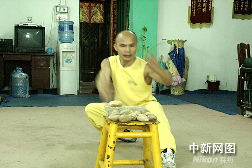中新網(wǎng)佛山9月22日電 (孫建駒 曾令華)在金庸、古龍的武俠小說(shuō)中常有武林絕技亮相,或飛天或遁地。記者今日在廣東高明區(qū)揚(yáng)龍武館看到,武館館長(zhǎng)黎偉軍用一雙肉掌劈鵝卵石如刀切豆腐一樣容易,正準(zhǔn)備攜鐵砂掌絕技參戰(zhàn)國(guó)慶黃金周舉行的廣東佛山十大武林高手擂臺(tái)賽。